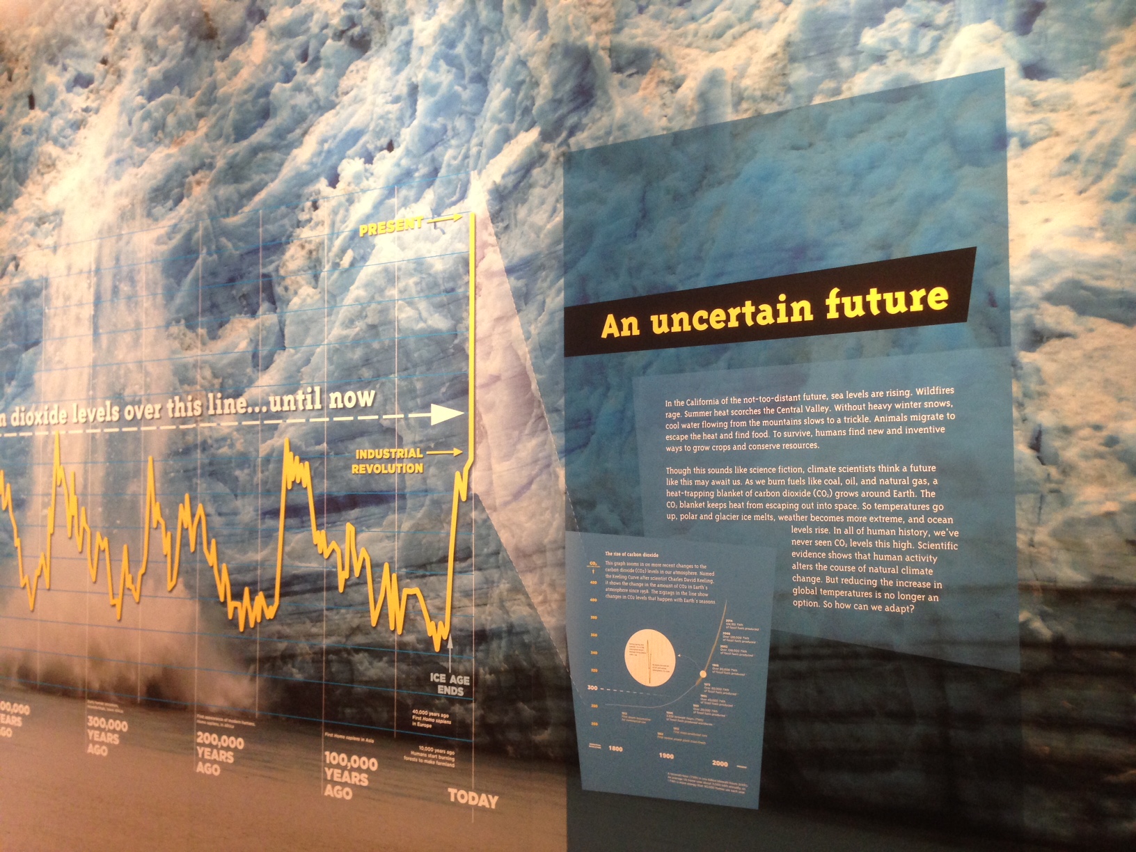 Determined to address misconceptions about climate change, the California Science Center used a single wall to grab visitors’ attention. Text encourages readers to imagine a future of climate extremes—and then take action to make positive change.